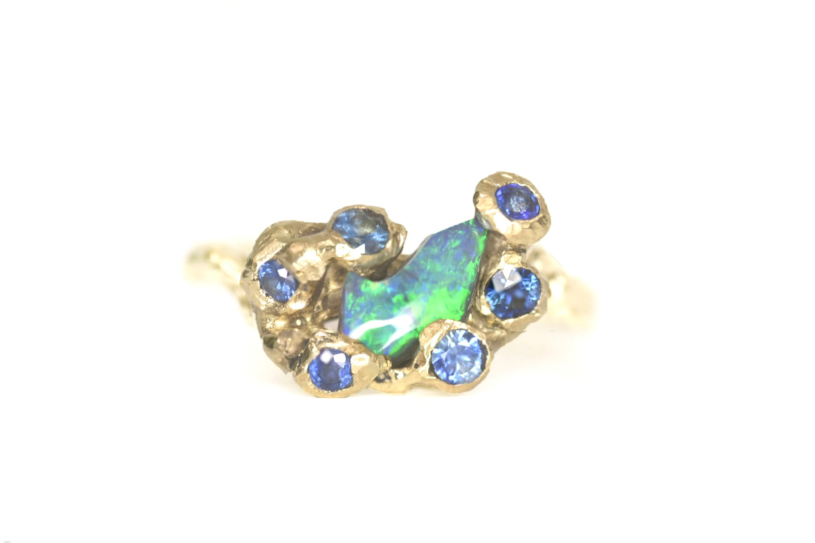 A unique ring that is inspired by the scenic and majestic cliffs of St Ives in Cornwall. The 0.75 ct black opal resembles the turquoise pools at the bottom of the sea cliffs, and sapphires the deep blue hues of the Atlantic ocean in the vast distance. This was sculptured on the cliffs of St Ives and encompasses a lot of the craggy rocks and caves that you can see there. Cast in 9k yellow gold.